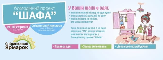 Мета акції «Шафа» – збір одягу для душевнохворих, які проходять довготривале лікування у Львівській обласній клінічній психіатричній лікарні. Вони потребують будь-якого одягу. Тому можна приносити одяг, який купили і жодного разу не одягали, який завеликий/замалий, який просто не носите, але шкода викинути.