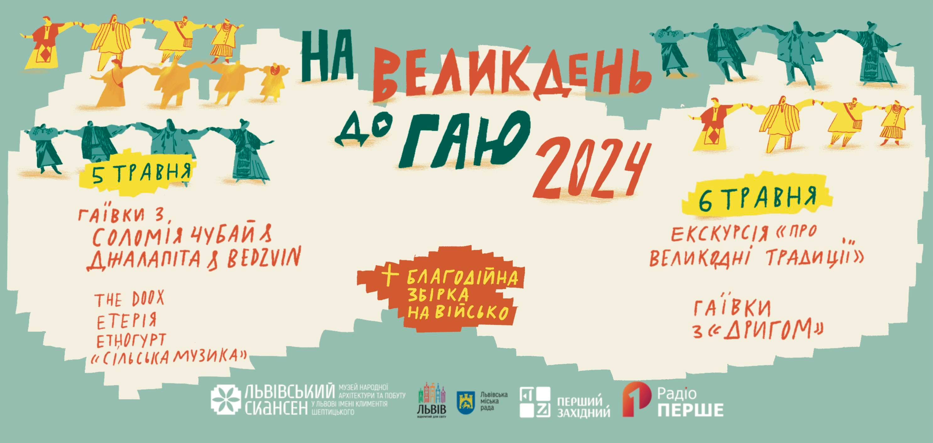 На Великдень у Львівському скансені лунатимуть гаївки як в автентичному, так і в сучасному виконанні, водитимуть кривий танець великі і малі, працюватимуть дві виставки, дитяча локація, ятки з музейним сувенірним крамом, фудкорти, а також буде велика благодійна збірка на ЗСУ.