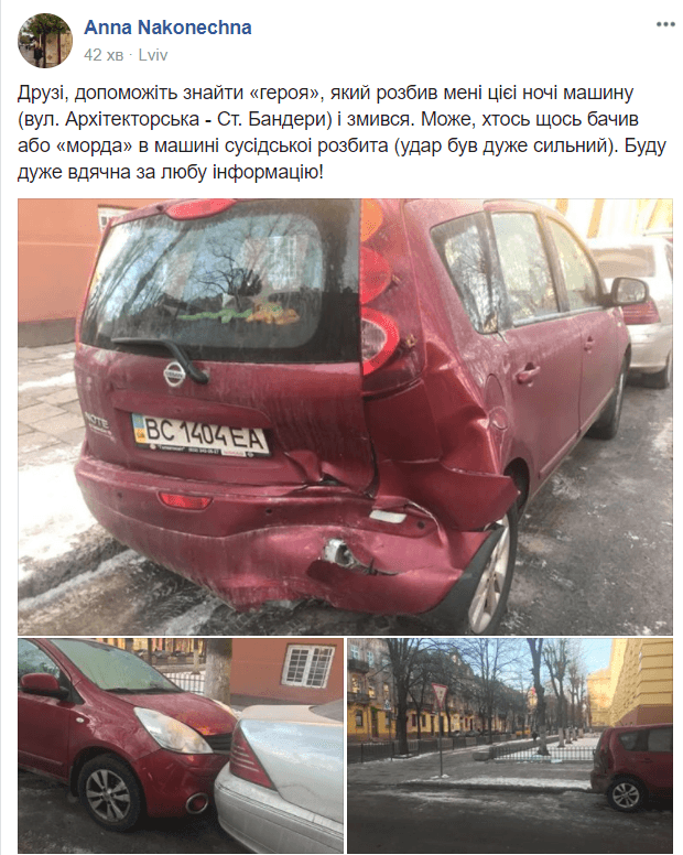 Заклик про допомогу написала львів’янка Анна Наконечна у спільноті «Варта1». За її словами, сьогодні вночі (з 19-го на 20-те січня) невідома особа протаранила її автомобіль. Від сили удару пошкодилася ще одна автівка, яка стояла поруч. ДТП сталася на перехресті вулиць Архітекторської та Бандери.