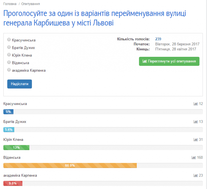 Проголосувати за назву вулиці можна онлайн за посиланням. Після вибору однієї з вулиць можна подивитися про результати поточного голосування і висловити свою думку в коментарях. Також можна написати своє звернення на електронну адресу [email protected] до 28-го квітня 2017-го року. Зараз лідирує варіант "вулиця Віденська".