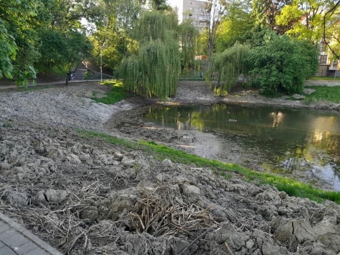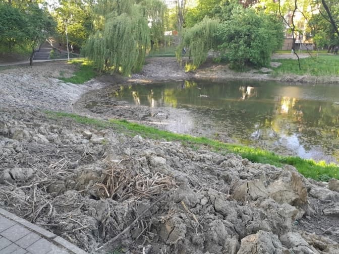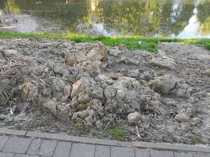 «Озера почистили, а намул з дна вигорнули на берег і залишили. Не вистачило коштів вивезти чи залишили на розплід? Цей намул, вигорнутий на берег, під час дощів поволеньки сповзає назад в озеро», – пише Yuri Verkhol у Facebook.