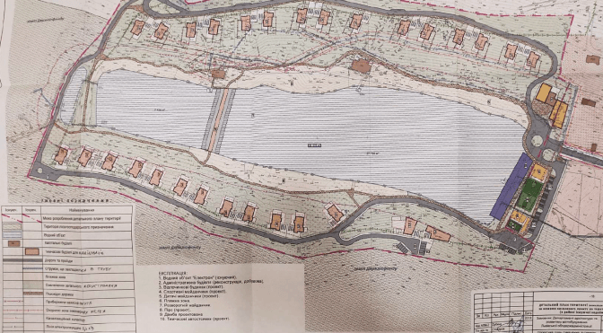 Раніше, у 2018 році, на цю територію розробили детальний план, згідно з яким землю навколо озера забудують так званими відпочинковими будинками. Як зазначено в детальному плані території, таких будинків можна розмістити 29 орієнтовною площею кожного 120-150 кв. м. Передбачалася також двоповерхова адміністративно-господарська будівля, спортивні та дитячі майданчики. Розробку ДПТ оплатив «Концерн-Електрон».