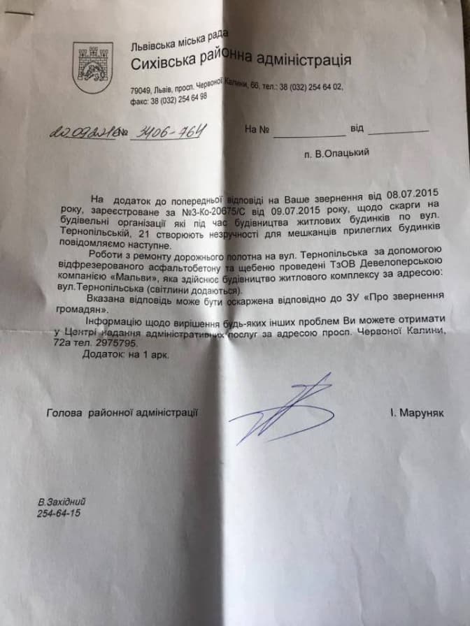 Відповідь з Сихівської райадміністрації від 2015 року