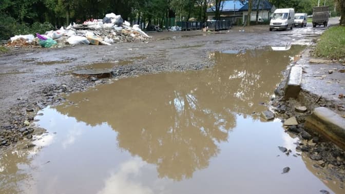 У дощ тут застрягали легковики. «Дороги у звичному для нас розумінні тут уже немає», – каже чоловік. Позбавлена асфальтового покриття вулиця стає небезпечною і для транспорту, і для пішоходів.