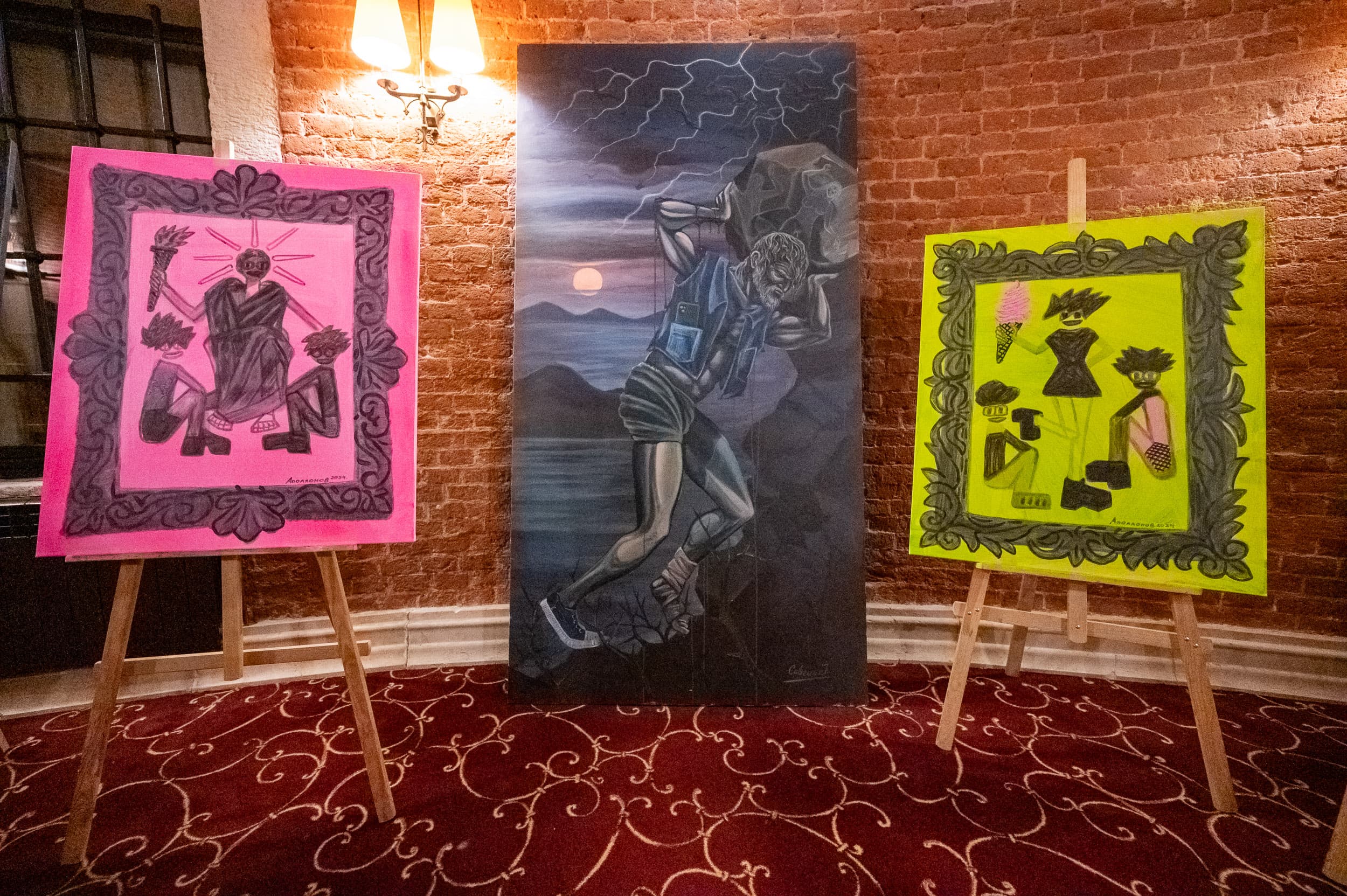 Як розповів митець, створення картини було спонтанним. Художник вирішив зробити перформанс: обмастився фарбою та ліг на полотно. Далі вже художник домалював те, що не відбилося. Саме тому картина Ігоря Савчина – найбільша на виставці, адже на ній зображений Сизиф зі зростом свого творця.