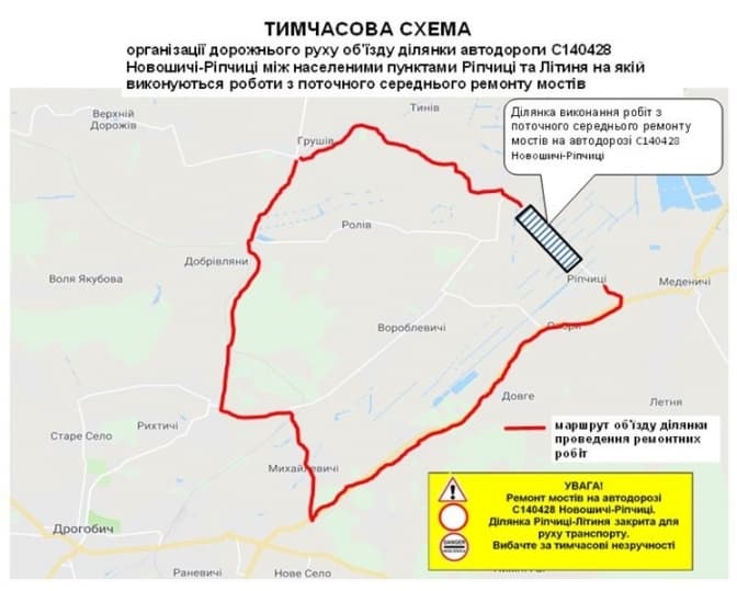 Йдеться про ремонт мостових переходів на трасі загального користування місцевого значення. Рух на ділянці між населеними пунктами с. Ріпчиці та с. Літиня перекриють 20 серпня. Об’їзд виконуватимуть згідно з розробленою тимчасовою схемою організації дорожнього руху.
