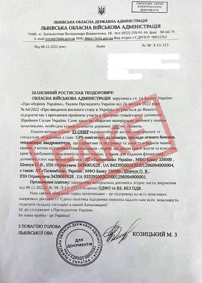 «Жителі Львівщини, зокрема підприємці, будьте уважні, шахраї почали надсилати листи з неправдивою інформацією, щоб виманити у вас кошти. У таких листах, які надсилають нібито від Львівської ОВА і нібито за моїм підписом, йдеться, що ми збираємо матеріальну допомогу нашим захисникам. Офіційно заявляю: ні я, ні Львівська ОВА, ні жоден працівник адміністрації таких зборів не проводимо», – йдеться в повідомленні.