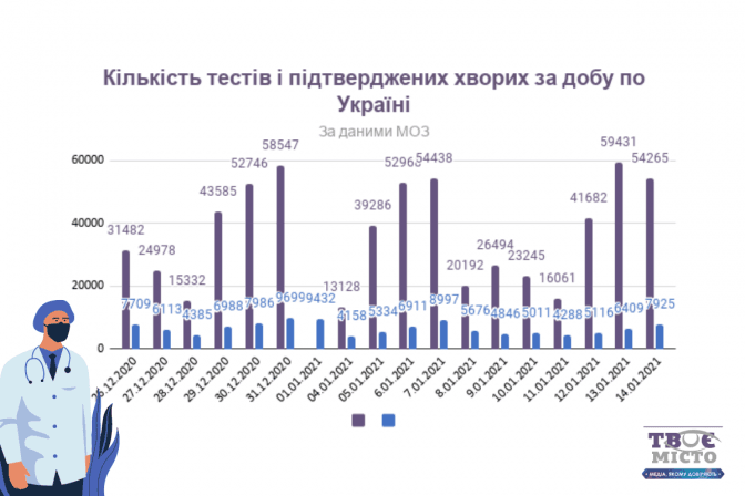 В Україні за добу підтвердили 7 925 нових випадків коронавірусної хвороби. У стаціонари госпіталізували 2 229 людей, померли від ускладнень 162 пацієнти, а одужали 10 192 українців. За добу в країні провели 54 265 тестувань.
