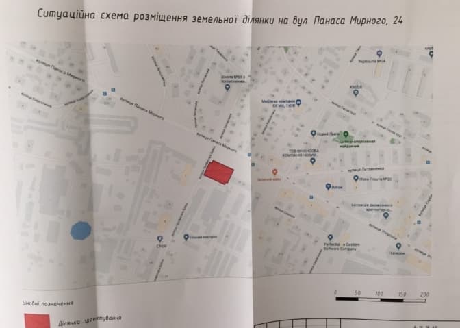 Висота будівель не має перевищувати 35 м. Від вулиці Буйка споруду мають відділяти 2,1 м, а від сусіднього будинку зі сторони Панаса Мирного – 12 м.