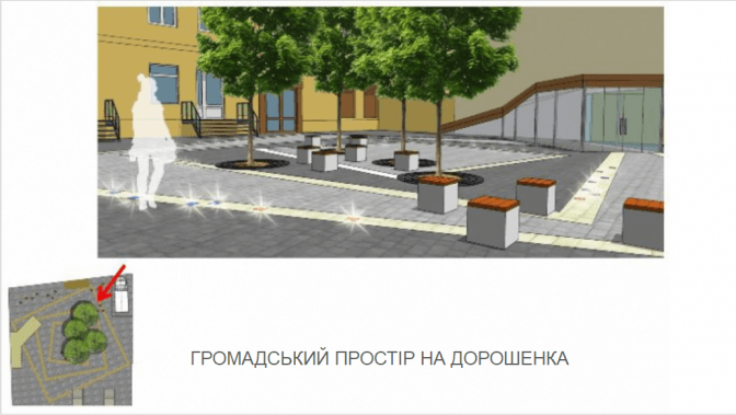 Нагадаємо, при облаштуванні громадського простору у сквері на вул. Дорошенка, 9, передбачено облаштування зони зелених насаджень з декоративними деревами. Замощення території буде виконано римським каменем темно-сірого та світло-сірого кольорів, також буде викладена гранітна тротуарна плитка та ледбруківка. Освітлення скверу буде здійснюватися за рахунок ледбруківки та розсіяного світла, яке падатиме на сквер з сусідніх будинків.
