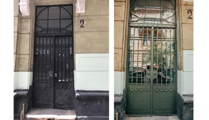 «Коли ми почали розчищати фарбу, то виявили первісний колір цих дверей: виявилося, що вони зеленими. Також відновили засклення дверей – раніше замість скла віконниці були забиті металевою бляхою. А ще виготовили нові ручки, бо автентичні були втрачені. Мешканці пам’ятали які там були раніше і показали на схожі у сусідньому будинку, тож ми виготовили їх за таким зразком», – каже реставратор Ігор Добрянський.
