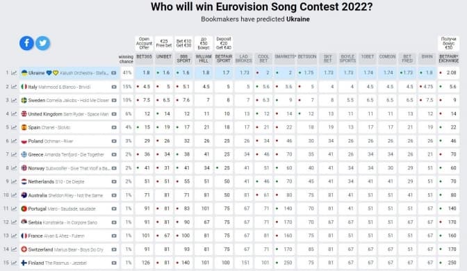 Так, зараз Kalush Orchestra зі своєю піснею Stefania мають 41% шансів на перемогу у Євробаченні. На другому місці знаходиться італійський дует Mahmood & Blanco з композицією Brividi, у якого 15% шансів. А третю сходинку займає представниця Швеції Корнелія Якобс з треком Hold Me Closer. У неї 10%.