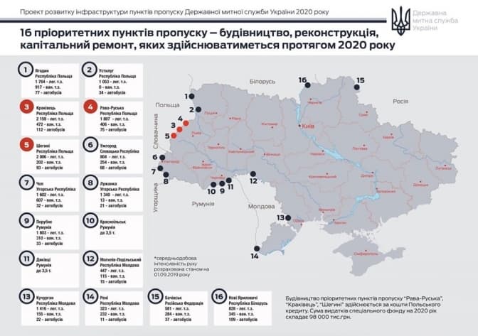 Йдеться про пункти пропуску Рава-Руська, Краковець та Шегині. Їх ремонтуватимуть за кошти польського кредиту. У спецфонді на ці роботи у 2020 році заклали 98 млн грн. Зокрема на пункті Рава-Руська мають збудувати новий пішохідний перехід через кордон із Польщею.