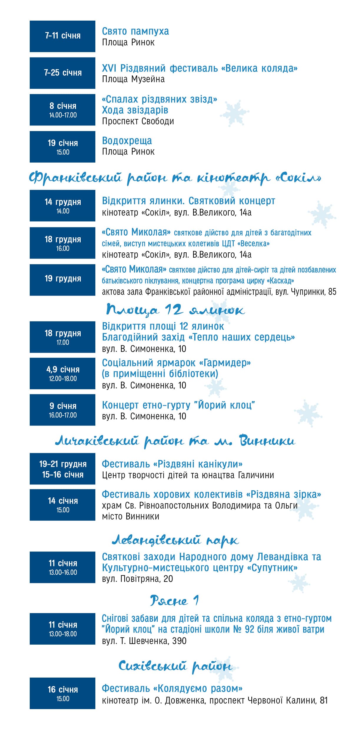 Протягом усіх канікул працюють Дитячі клуби Львова, а до 19 січня у Львові на проспекті Свободи та на площі Ринок традиційно працює Львівський ярмарок.