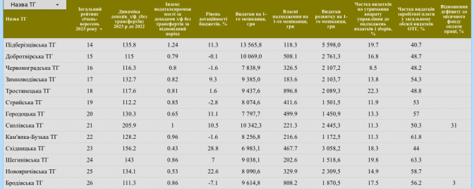 Водночас Боринська, Підкамінська, Стрілківська, Хирівська та Добромильська громади посіли останні місця. Рівень дотаційності їхніх бюджетів становить понад 40-50%.