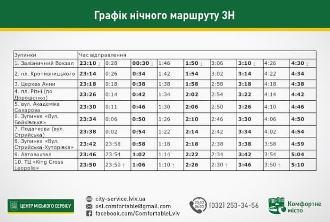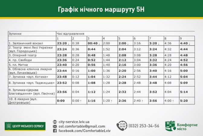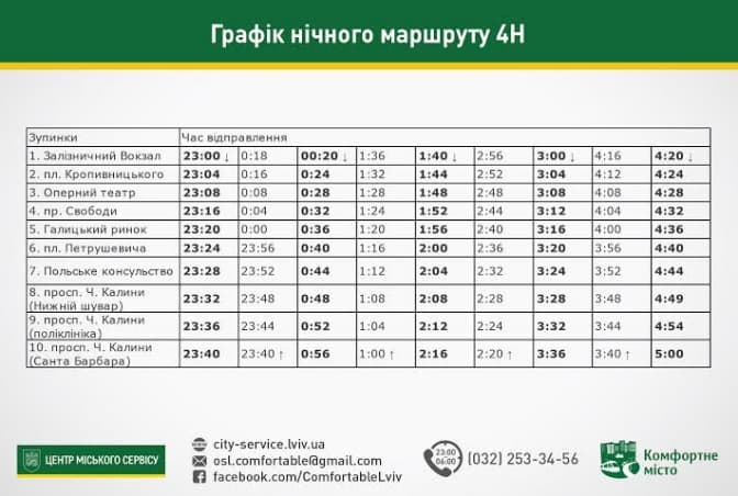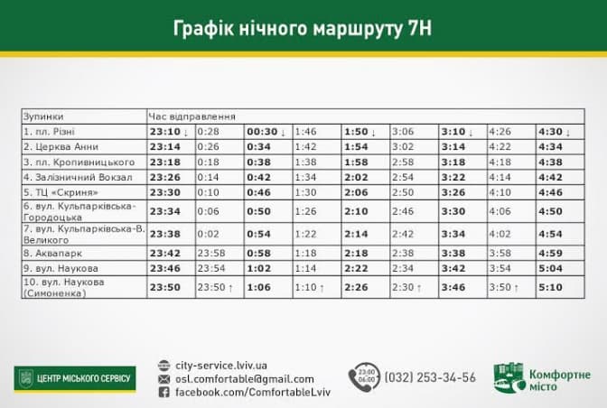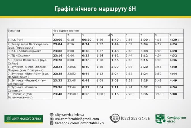 Від початку місяця у Львові розпочали курсувати нічні автобуси, які їздять за сімома маршрутами. На час обстеження на кожному нічному маршруті працює одна транспортна одиниця. Вартість проїзду становить 8 гривень. Посвідчення на безоплатний проїзд пільговим категорія пасажирів у нічному транспорті не діють.