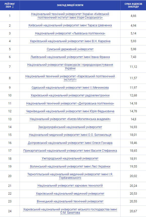 Перше місце рейтингу вдруге поспіль посів Київський політехнічний інститут ім. Сікорського. Під ним залишився Київський національний університет ім. Шевченка. На третю позицію піднялася НУ «Львівська політехніка», яка покращила свій результат на одну позицію.