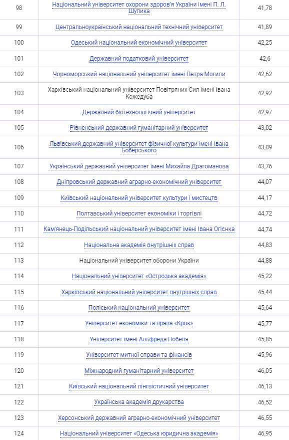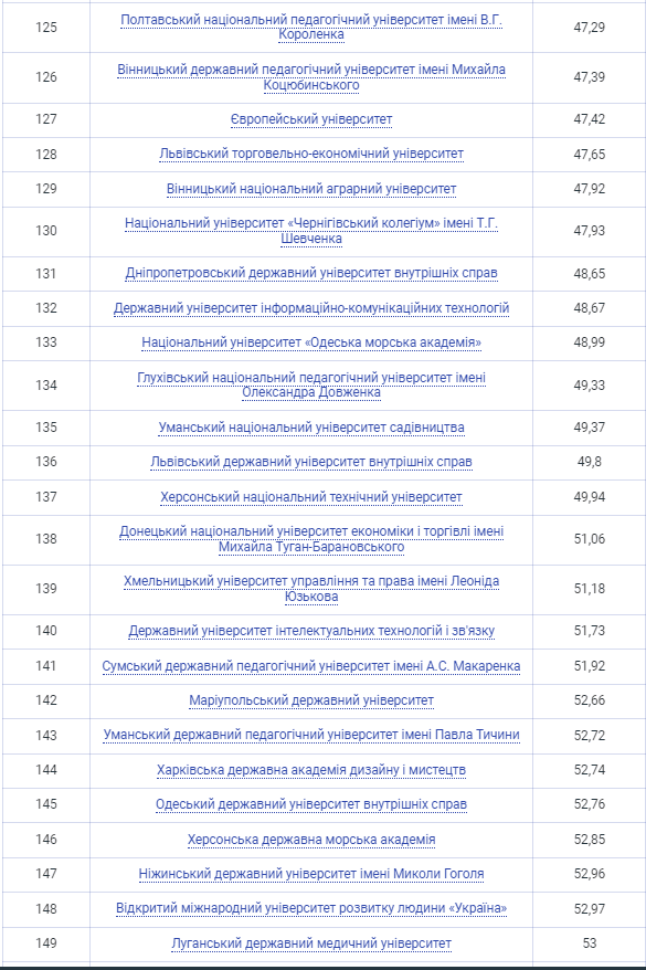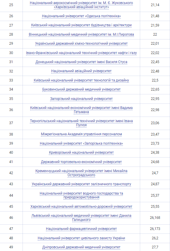 Четверте місце зайняв Харківський національний університет ім. Каразіна, який опустився на одну позицію. П'яту сходинку посів Сумський національний університет, що піднявся з шостої позиції минулого року. Шосту позицію зайняв Львівський національний університет ім. Франка, опустившись з п'ятої.