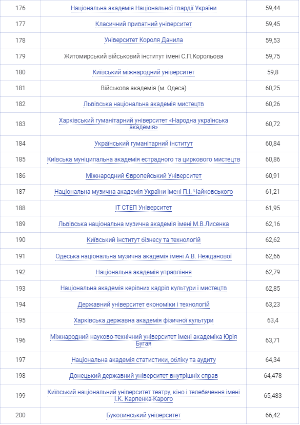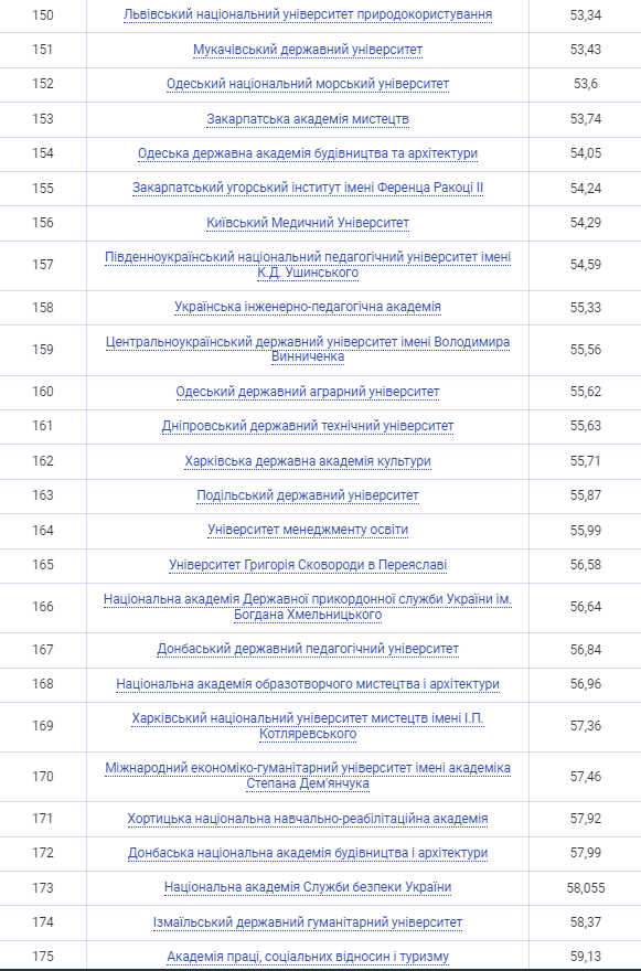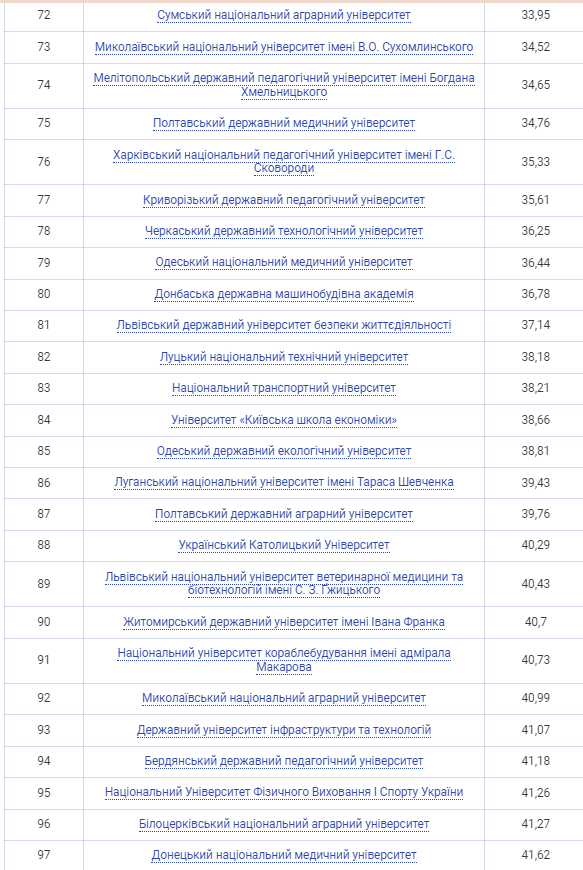 До найкращих 20 університетів України цього року ввійшли п’ять київських університетів, два львівських, три університети з Харкова, Тернополя й Дніпра, а також по одному представнику з Ужгорода, Луцька, Одеси, Івано-Франківська, Чернівців і Сум.