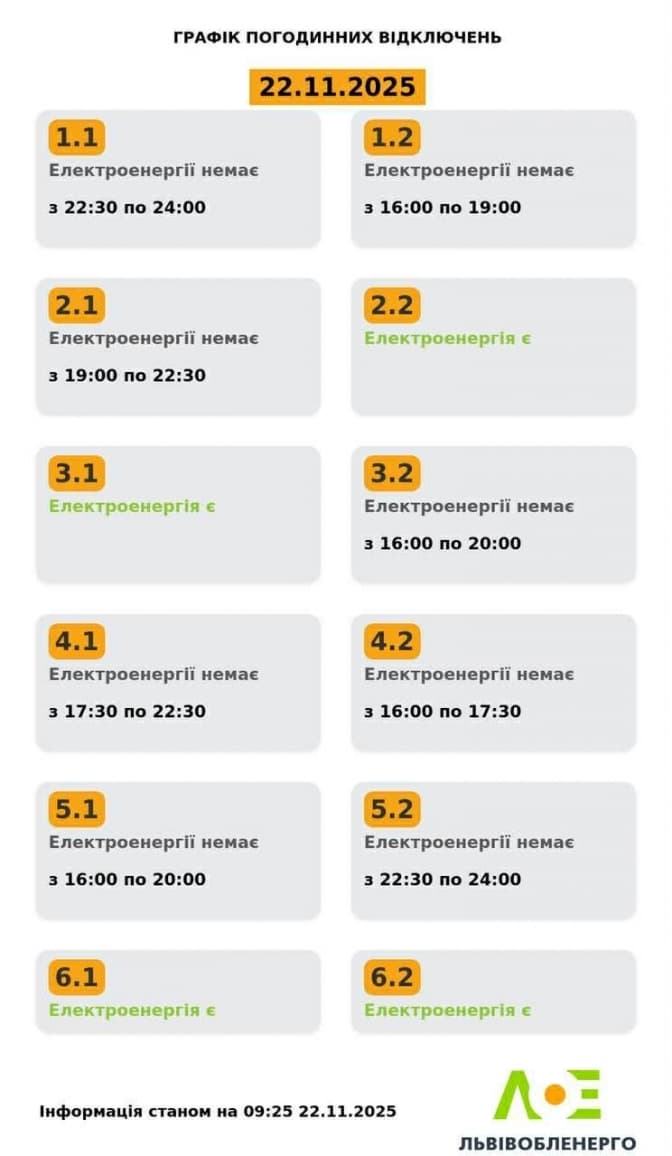 У Львові та області на 22 листопада станом на 10:00 оновили графіки відключень світла. Про це повідомили у «Львівобленерго».