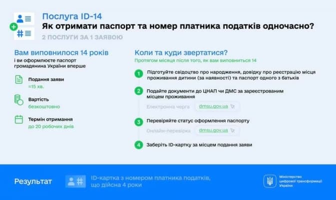 Тепер же діти при досягненні 14 років можуть одночасно отримати паспорт і номер платника податків. Послуга ID-14 безкоштовна. Отримати її можна в усіх відділах ДМС України, мережі центрів “Паспортний сервіс”, деяких ЦНАПах, що надають паспортні послуги.