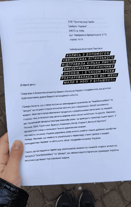 «Мені написала Настя Чайківська: Привіт, як я можу допомогти з українською мовою? Я порадив почати з написання листів імпортерам, зокрема і Head&Shoulders. Настя активно включилася в роботу – надіслала десятки листів. Не пройшло і восьми місяців, як ми всі отримали результат – шампуні з українськими написами!», – повідомив мовний активіст.