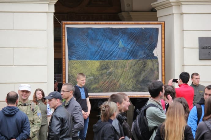 Сам художник розповідає, що знайшов прапор на барикаді на вул. Інститутській: «Після того, як ми там відбили атаки – в цьому хаосі я його знайшов». Прапор розмістили прямо біля входу до міської ради, біля нього виставили почесну варту.