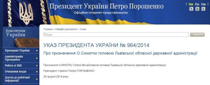 Президент Петро Порошенко призначив голову Львівської обласної державної адміністрації. Ним став Олег Синютка, який з 2007 року працює першим заступником міського голови Львова.