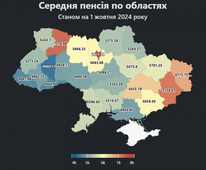 Водночас найменші виплати у Тернопільській (4460 грн), Чернівецькій (4664 грн) та Закарпатській (4697 грн) областях.