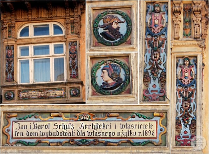Зовні будинок виконаний у стилі неоренесансу з елементами маньєризму. Під одним із вікон із вулиці Хмельницького зберігся напис, що свідчить «Ян і Кароль Щульц, архітектори і власники, збудували цей дім для власного вжитку 1896 року». Вікна оздобленні фігурками людей та кольоровими сплетіннями.