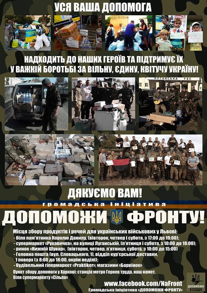 «На всі збірки біля памятника Королю Данилу просимо приносити теплі речі, ліки, цигарки, лимони, поповнення рахунку мобільного телефона, спальники, ковдри, спідню білизну», – пише у себе на Facebook активістка Люба Возняк.