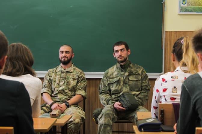 Дев’ятикласники поспішають на п’ятий урок. Здивовано роззираються, заходячи до класу; розглядають нових учителів у військовій формі. Це Андрій Каретник і Дмитро Гурний – бійці 5-го окремого батальйону Добровольчого українського корпусу. Обоє рятували поранених на фронті, а тепер у львівській школі №48 вперше проводять практичний урок із надання першої домедичної допомоги. Упродовж тижня уроки на різні теми, де вчителями були волонтери та учасники бойових дій, пройшли у шести школах Львова. На одному з них побувала кореспондентка Tvoemisto.tv.