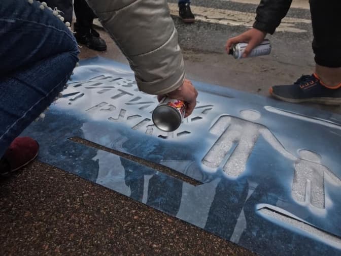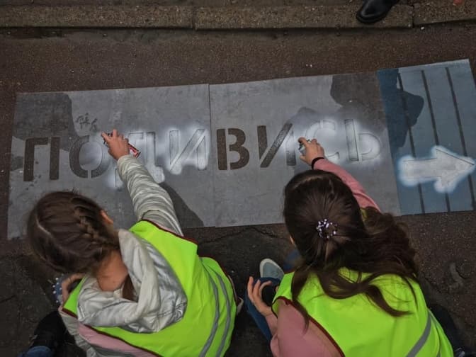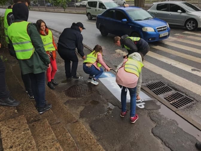 На тротуарах перед пішохідними переходами патрульні, спільно з учнями школи, за допомогою трафаретів, нанесли попереджувальні надписи «Візьми дитину за руку», «Зніми навушники», «Сховай телефон», «Подивися праворуч», аби закликати пішоходів бути уважними на дорозі.