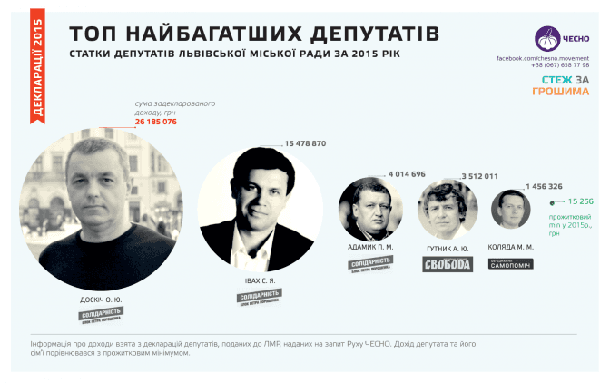 Найбільший дохід за 2015 рік серед депутатів Львівської міської ради задекларував депутат від БПП “Солідарність” Остап Доскіч. Загальна сума задекларованого доходу депутата та членів його сім’ї становить майже 28 млн грн