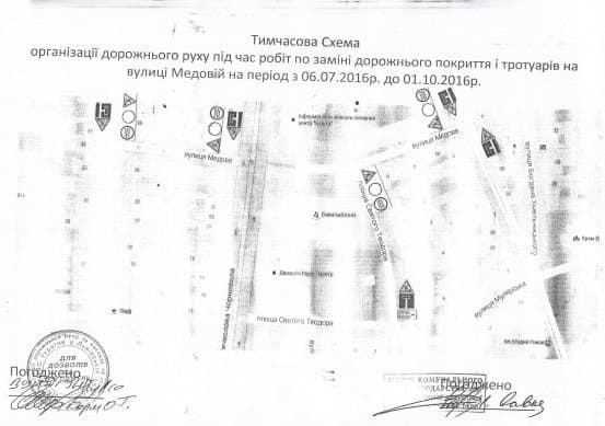 Відтак рух транспорту вулицею Медовою буде перекритий від сьогодні, 6 липня, з 9:00 год і до 21:00 год 1 жовтня, у зв’язку з проведенням капітального ремонту. Тут замінюватимуть дорожнє покриття та тротуари. Об’їзд буде здійснюватися згідно з тимчасовою схемою організації дорожнього руху: