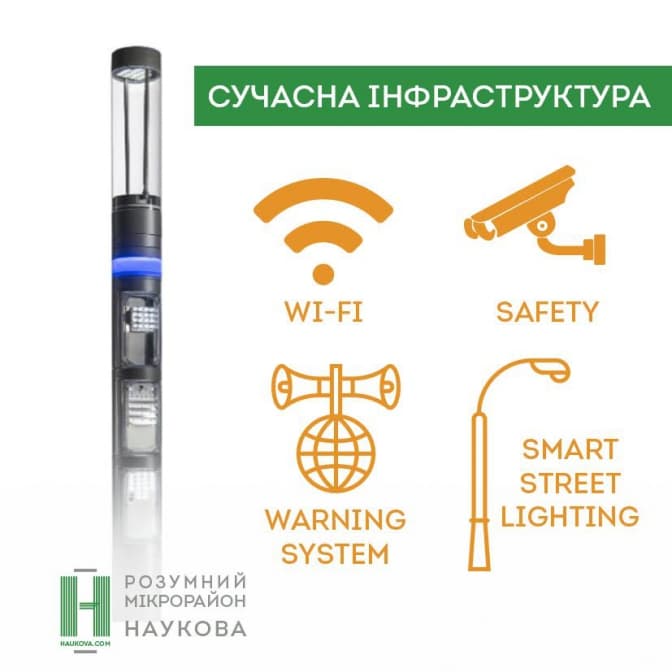 Район «Наукова» – це міні-прототип міста. Тут є 84 багатоповерхівки, 20 навчальних закладів (садочки, школи, коледжі, позашкілля), 10 громадських просторів, 2 медичні заклади, не менше 9 торгових центрів та 3 релігійні установи, 22 зупинки громадського транспорту, а також 4 потужних осередки, де розвивають IT технології. Інфраструктура мікрорайону є дуже розвиненою, тому у ньому вдасться застосувати якнайбільше нових технологій.