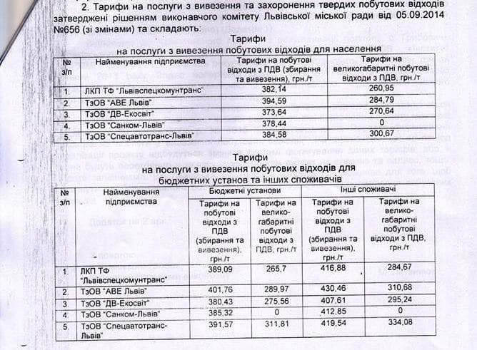 Водночас голова фракції партії УКРОП у Львівській міській раді Ігор Телішевський оприлюднив проект рішення виконкому, де вказано нові тариф за вивезення тонни сміття для кожної з категорій споживачів і кожного з шести операторів ринку.