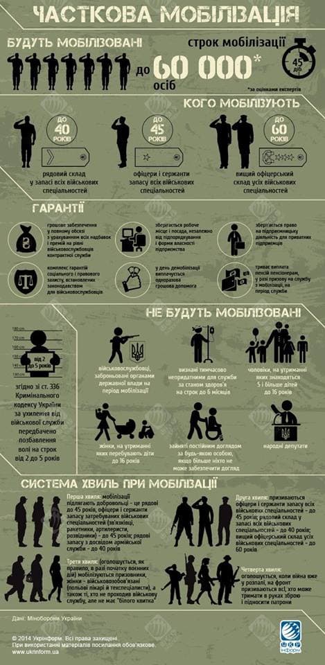 Нині до армійських лав мобілізовуватимуть передусім чоловіків від 25 до 40 років, які проходили строкову службу у збройних силах, навчалися на військових кафедрах. Здебільшого саме їх відправлятимуть у зону АТО після проходження військових навчань. Однак поряд з цим частково будуть мобілізовані і ті, хто не служив в армії, зокрема через стан здоров’я чи з інших причин. "Буде повторна перевірка військовозобов’язаних, які через стан здоров’я не можуть виконувати свої обов’язки. Про це вони повинні будуть заявити на військових комісіях після чого військовий комісар направлятиме їх на повторне проходження військово-лікарських комісій", - зазначив полковник Олександр Правдивець, який у Генеральному штабі Збройних сил України відповідає за мобілізацію.