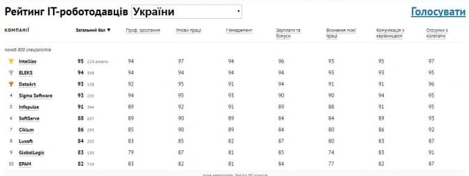 Компанія Intellias посіла перше місце, ELEKS – друге, SoftServe – шосте.