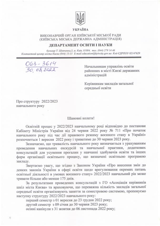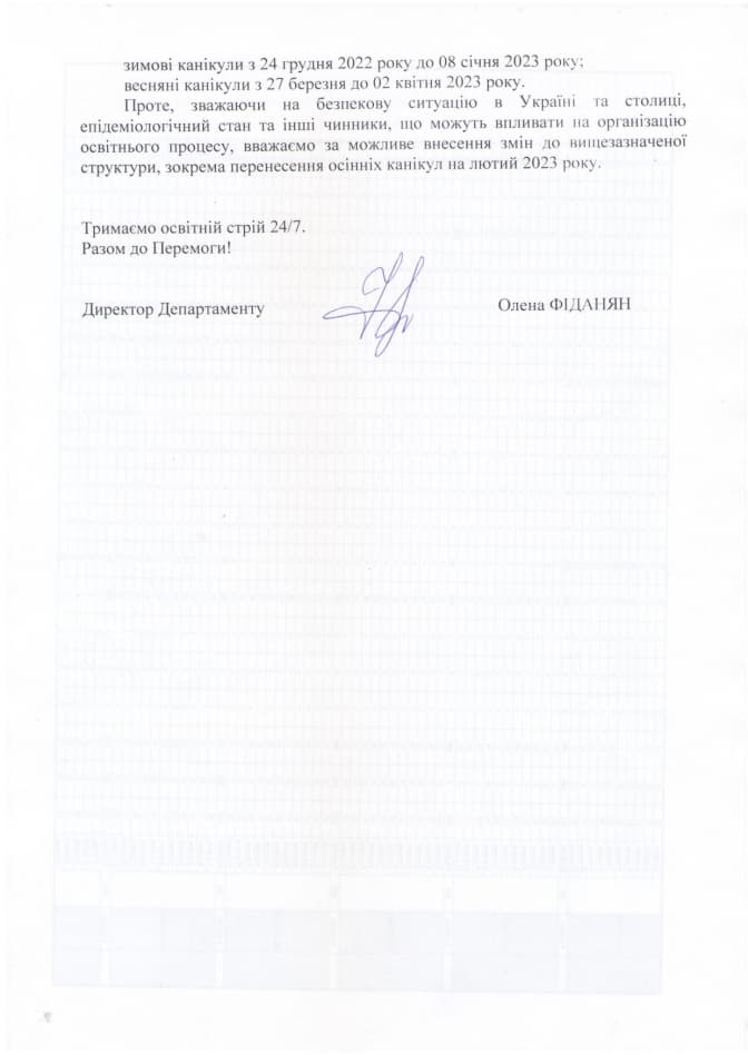 «Зважаючи на безпекову ситуацію в Україні та столиці, епідеміологічний стан та інші чинники, що можуть впливати на організацію освітнього процесу, вважаємо за можливе <...> перенесення осінніх канікул на лютий 2023 року», – заявив департамент.