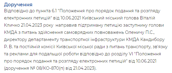 Міський голова уже направив її для подальшої роботи заступнику голови КМДА з питань здійснення самоврядних повноважень, директору департаменту транспортної інфраструктури КМДА та постійній комісії Київської міської ради з питань транспорту, зв’язку та реклами.