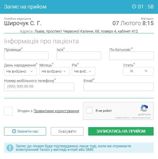 3. Після перенаправлення на сторінку 4-ї поліклініки обрати лікаря, зручну годину, ввести особисті дані та зберегти інформацію, натиснувши «Записатись на прийом»