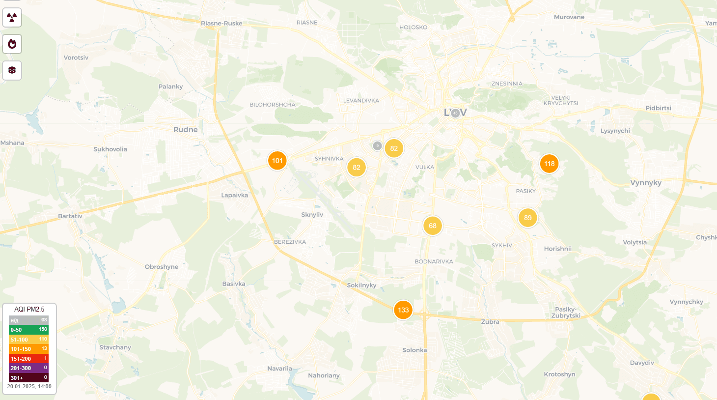 В соцмережах поширюють інформацію про погіршення якості повітря у Львові та смог у деяких районах. Так, за даними карти якості повітря від ЛУН, в Личаківському районі, на вул. Латвійській, індекс якості повітря (AQI) становить 118, що більше за норму. Крім того, в Сокільниках, що біля Львова, індекс якості повітря становить 133, а на вулиці Городоцькій – 101.