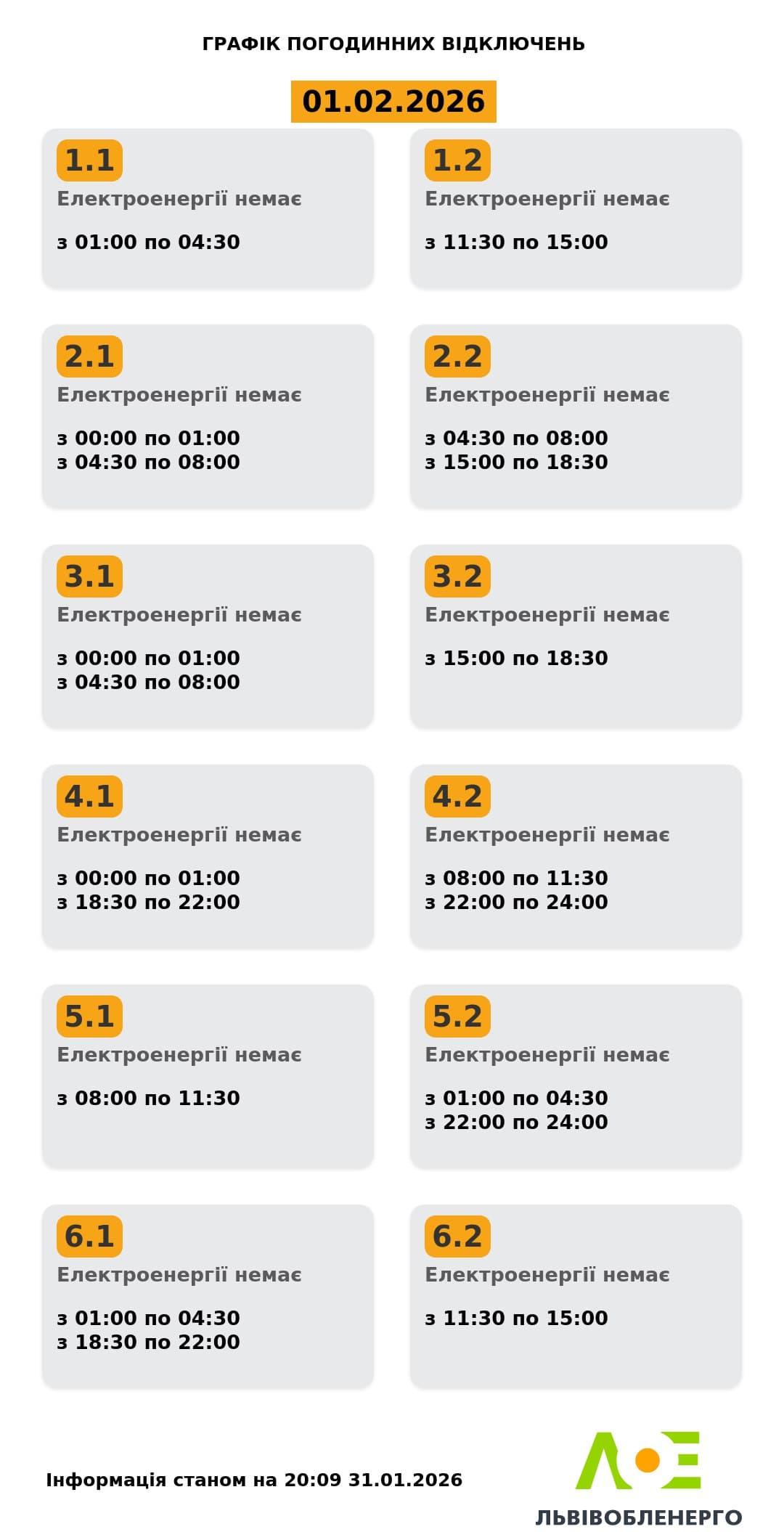 Львівобленерго опублікувало графіки відключень світла на 1 лютого.