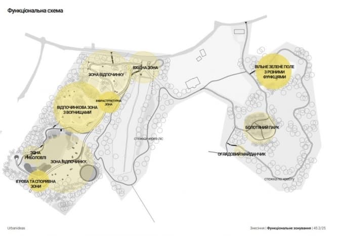 Для покращення середовища планують облаштувати доступні доріжки, терасу над водою, зони відпочинку з місцями для вогнища та пікніків. Спортивні та ігрові зони будуть виконані з природних матеріалів, зокрема, планується встановлення турніків, лабіринтів-балансирів та лазанок.