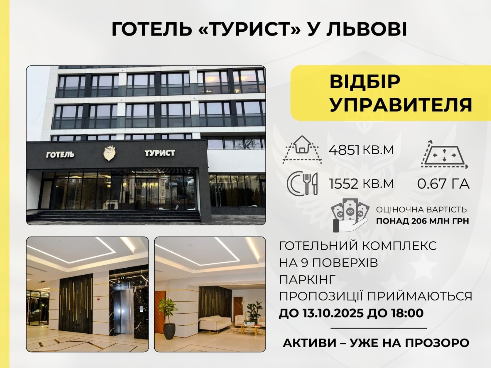 Агентство з розшуку та менеджменту активів (АРМА) оголосило відкритий конкурс на платформі Prozorro для відбору управителя арештованого готелю «Турист», розташованого на вул. Коновальця, 103 у Львові. Актив було передано в управління АРМА на підставі ухвали Печерського районного суду міста Києва.