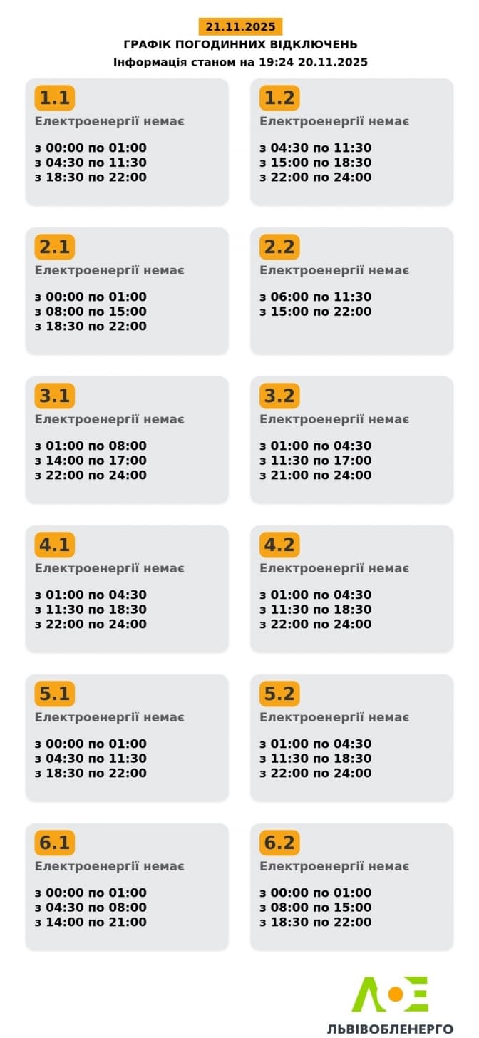 У Львові та області на 21 листопада ввели графіки відключень світла. Про це повідомили у «Львівобленерго».