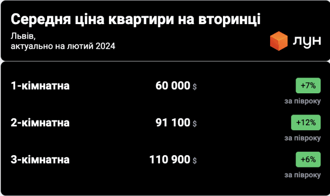 За останні шість місяців вартість житла на вторинці у Львові зросла. Медіана однокімнатної в лютому у Львові становить 60 000 доларів, що на 7% більше ніж пів року тому, двокімнатної 91 100$ (+12% за пів року) трикімнатної 110 900$ (+6% за пів року). Про це свідчать дані ЛУН.