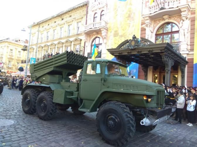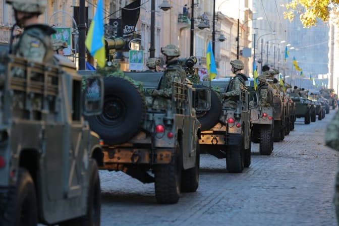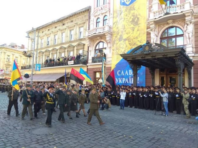 Сьогодні, 14 жовтня, з нагоди Дня захисника України центральною вулицею Львова пройшлась колона військових, волонтерів, реконструкторів та ветеранів УПА. Супроводжувала колону військова техніка та озброєння, яким користуються Збройні сили України та Нацгвардія.