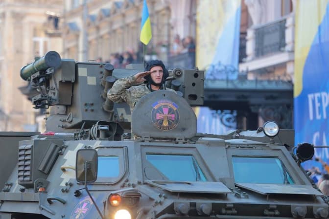 Марш захисників України супроводжувала колона військової техніки – більше 50 сучасних зразків, які зараз представлені на озброєнні Сухопутних військ Збройних Сил України.